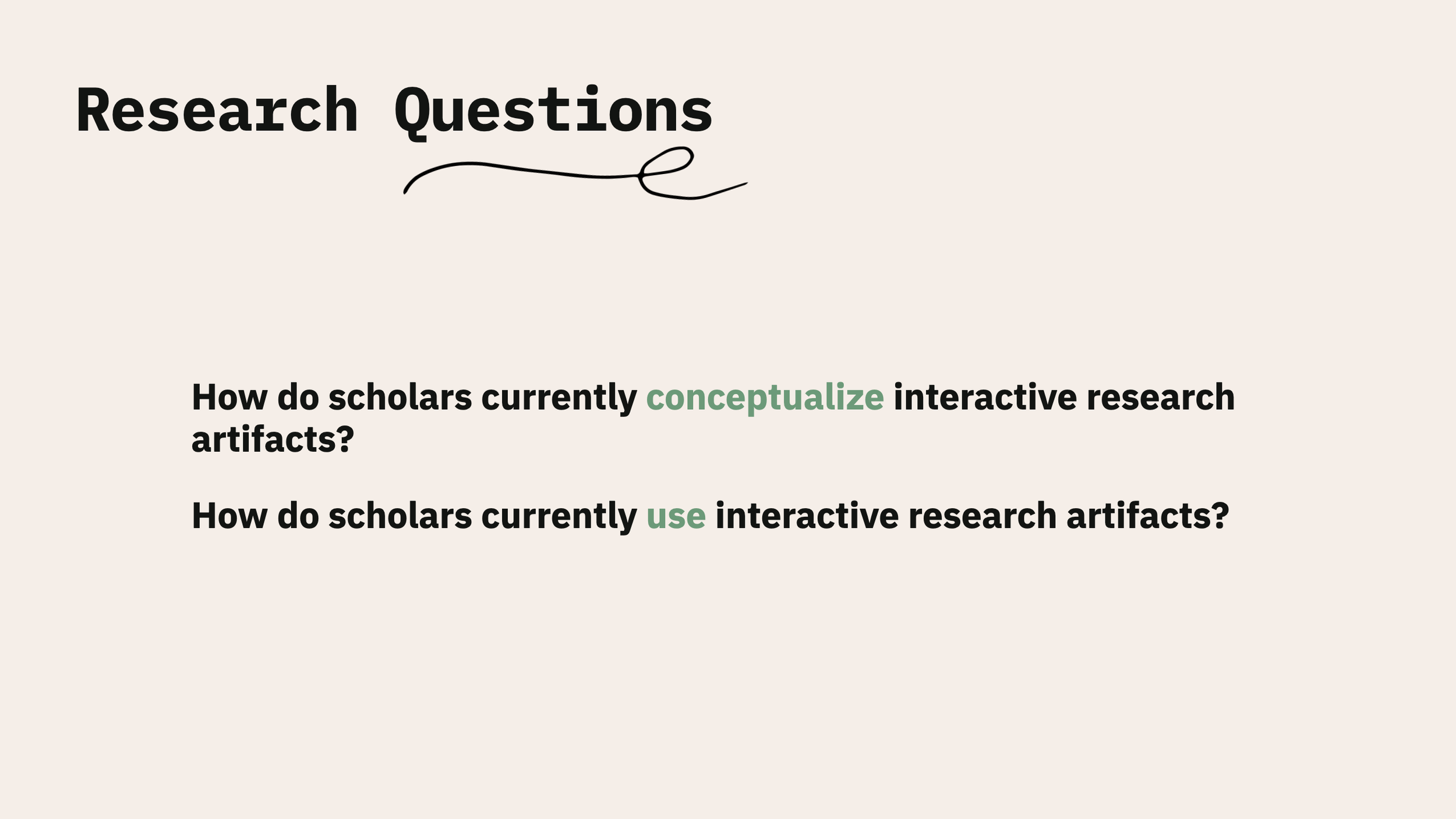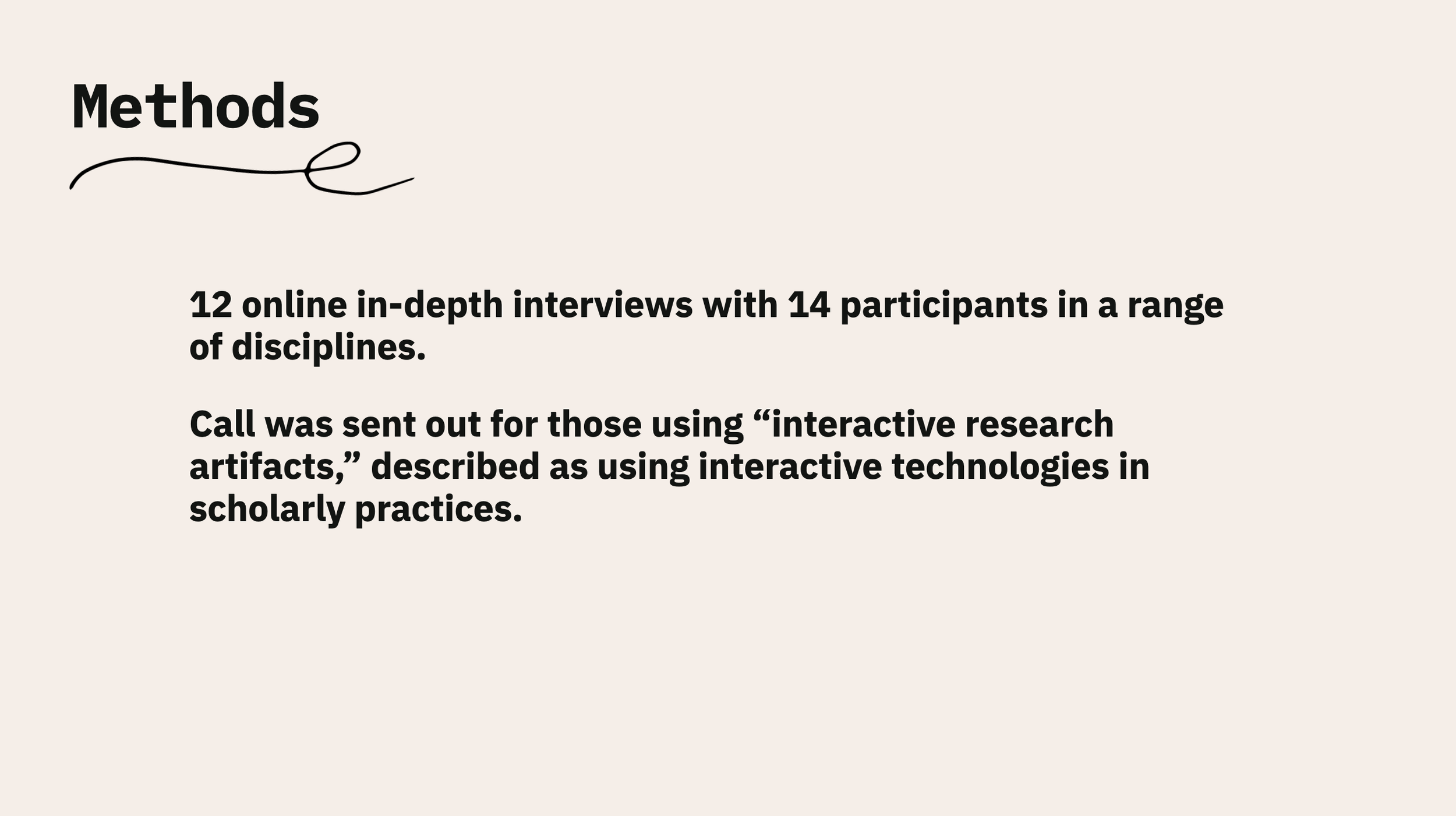 A call was sent out for those using “interactive research artifacts,” described as using interactive technologies in scholarly practices. Rather than presenting participants with a definition of this, this work allowed participants to identify themselves as creators and/or users of these artifacts.
