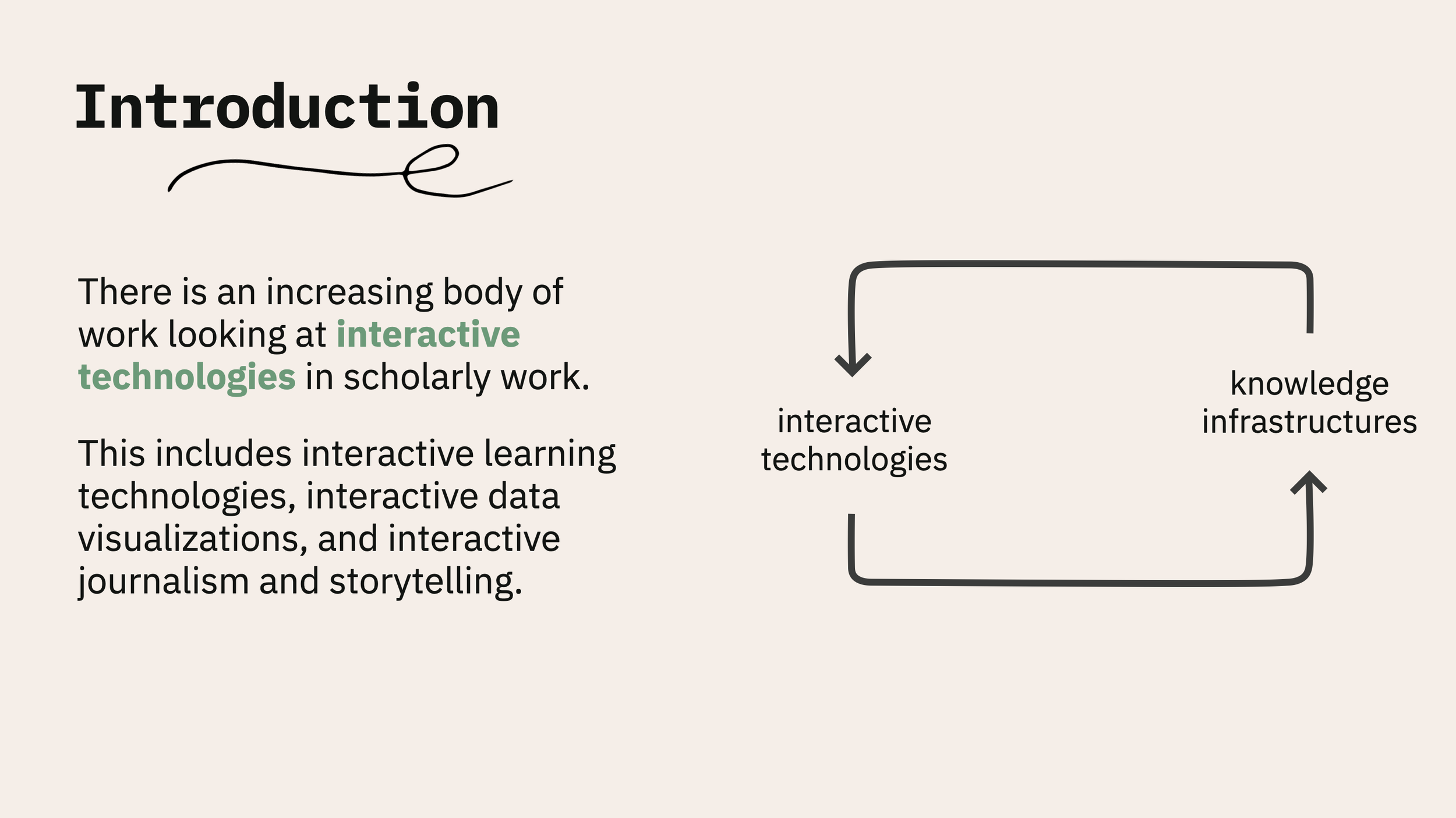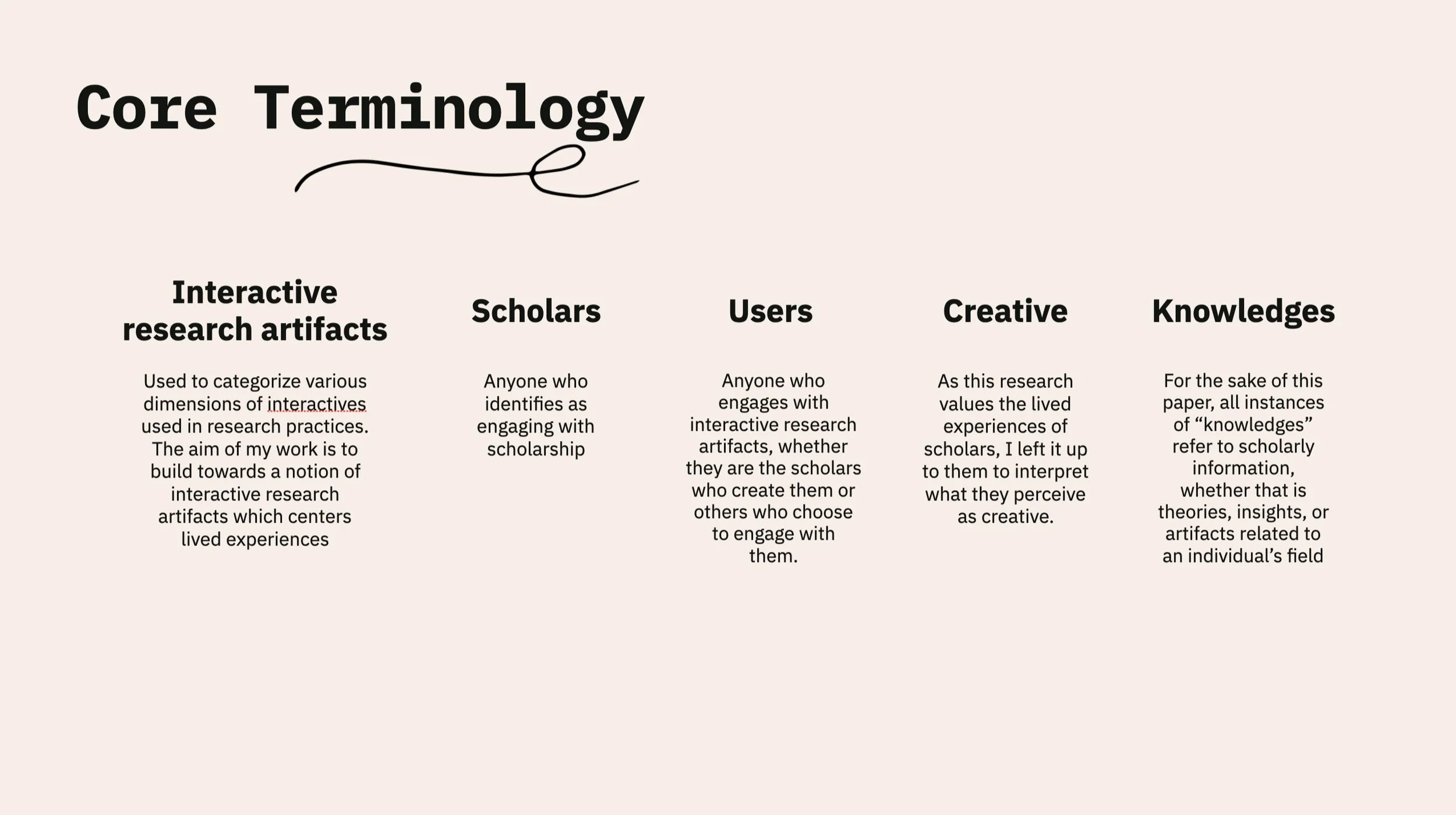 It’s important to note that the term interactive research artifacts is used to categorize various dimensions of interactive digital artifacts used in research practices. It is a purposefully broad term, as there is currently minimal literature which seeks to conceptualize these artifacts, and the aim of my work is to build towards a notion of interactive research artifacts which centers lived experiences
