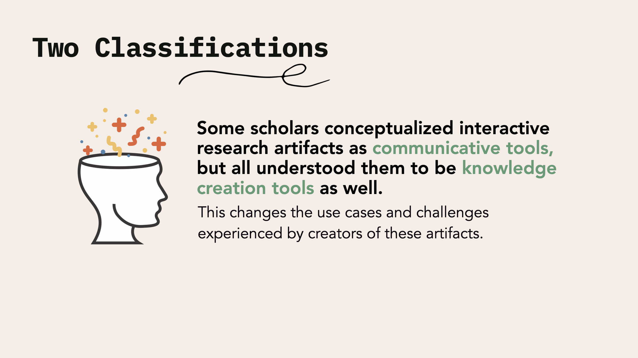 As suspected from previous literature in this space, interactive research artifacts can act as communicative tools for scholarly knowledge. While only some participants detailed their understandings of interactive research artifacts to include this communicative tool classification; all discussed, both implicitly and explicitly, the ways interactive research artifacts alter knowledge creation practices during the research stage, rather than only the output stage.