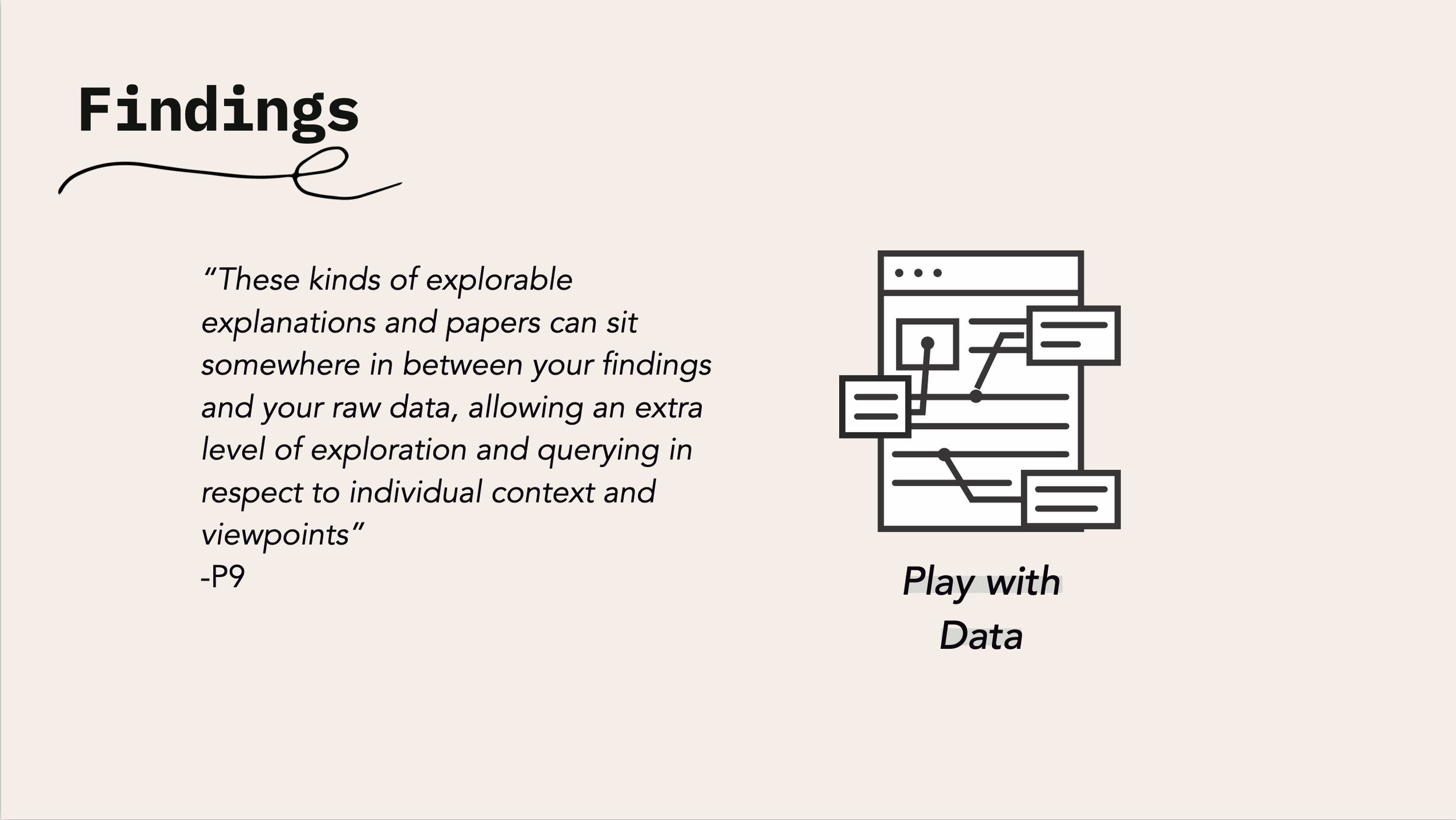 Data does not only refer to quantitative data – some participants described how remixing existing interactive research artifacts fosters dialogue between the users and the content itself. Not only does this element of interactive research artifacts allow users to leverage existing scholarly work, but it also encourages them to constellate information differently by providing a multiplicity of options. This may enable the discovery of new findings otherwise obscured.