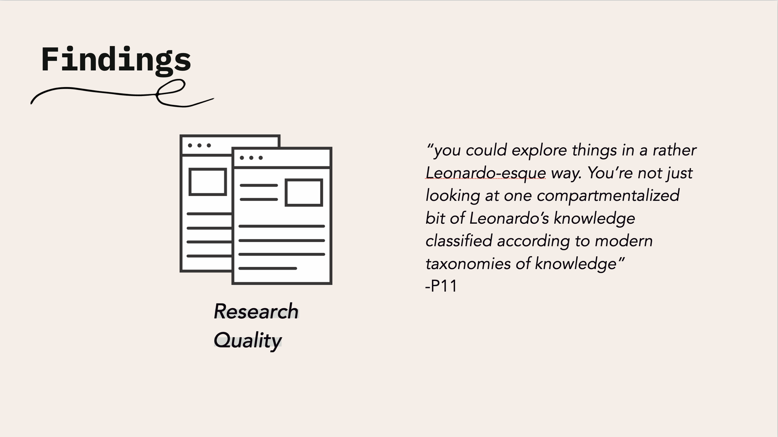 By providing alternative, non-linear modes of exploring knowledge, interactive research artifacts allow P11, an art historian focused on Leonardo Da Vinci, to produce a caliber of research not quite possible by traditional means. For them, this meant allowing users to immerse themselves in da Vinci’s mindset, centered around da Vinci’s cultural prototyping of a renaissance type of person with a multiplicity of knowledges.